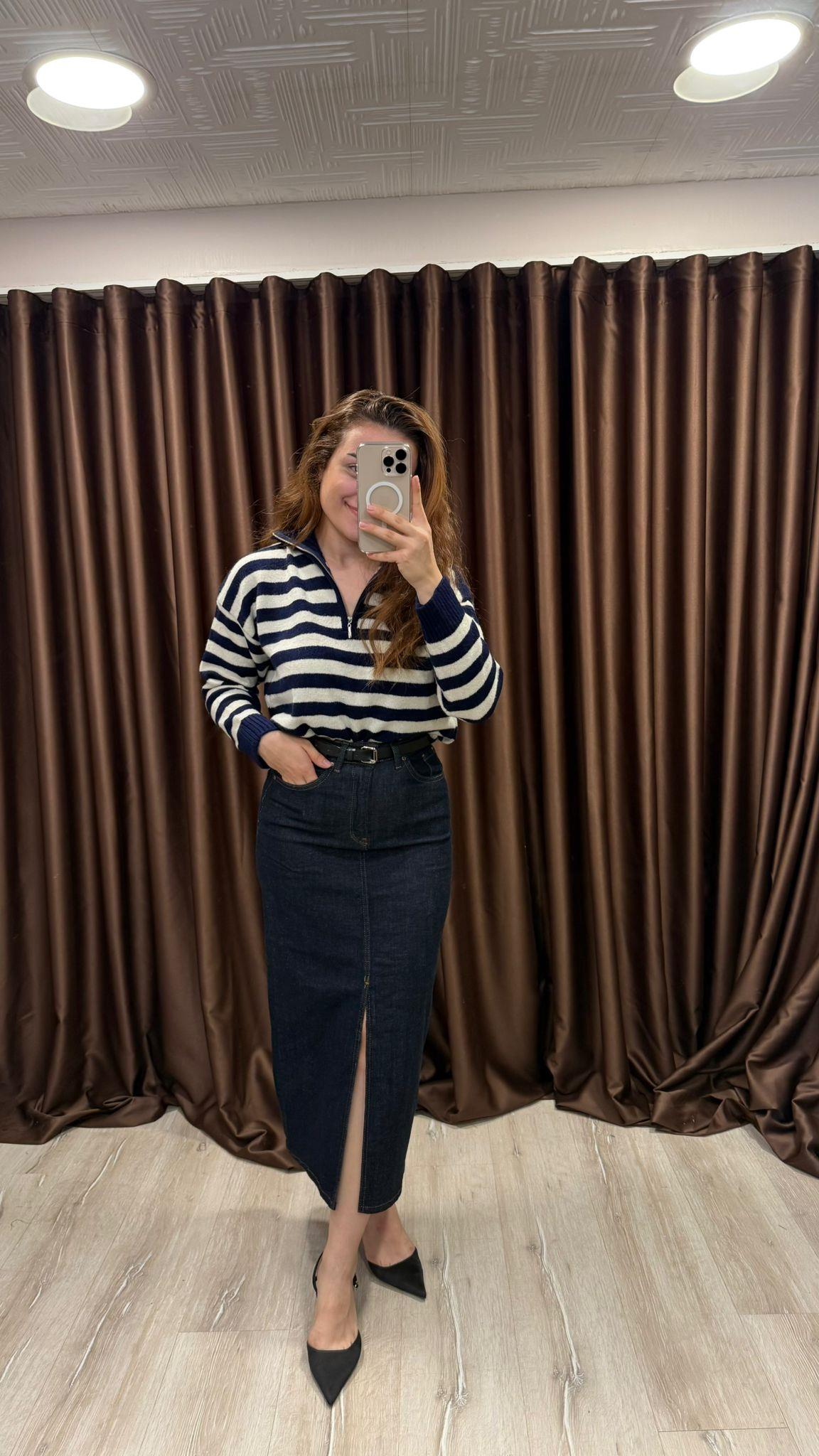 Denim Midi Etek Lacivert